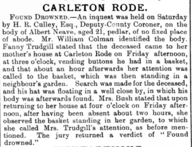 In 1890 whilst living on Flaxlands, Elizabeth Bush witnessed the tragic death of a vulnerable young man – the following report appeared in the Diss Express in May, 1890.